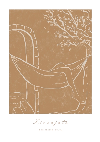 "Genieße das Leben" Poster von Ateljé Anagram. Sanfte Pfirsichtöne treffen auf minimalistische Linien – hier schaukelt jemand entspannt in der Hängematte, als gäbe es nichts Dringlicheres als genau diesen Moment. Die abstrakte Baumkrone flüstert von einem stillen Garten, irgendwo zwischen Ruhe und süßer Muße. Ein Bild, das dich einlädt, das Jetzt zu feiern und einfach mal abzuschalten. Fast so, als würde es sagen: Chill mal, das Leben wartet nicht.
