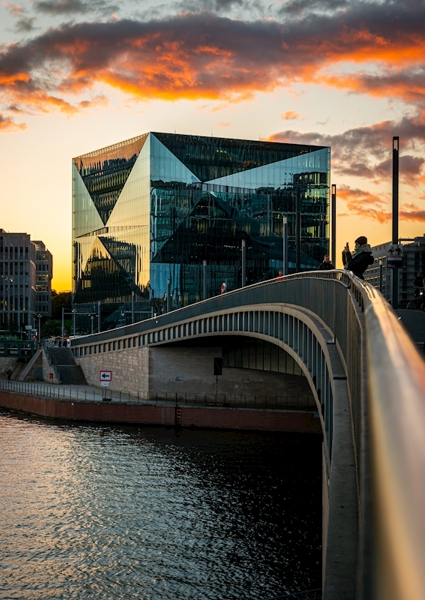 "Sonnenuntergang Cube Berlin" Poster von tbuberlin. Die Glasfassade des Cube fängt das Feuer des Sonnenuntergangs ein – Berlin-Mitte zeigt hier, wie urbanes Design und Natur sich an einem Punkt treffen. Die Brücke zieht dich quasi mitten rein, über die Spree, vorbei an den letzten Lichtstrahlen eines Tages, der mehr versprach. Architektur, die nicht nur steht, sondern lebt – ein perfektes Stück Stadt, das du immer wieder neu entdecken willst. Berlin, aber eben nicht von der touristischen Seite. Mehr so: Echt, roh, mit Stil.