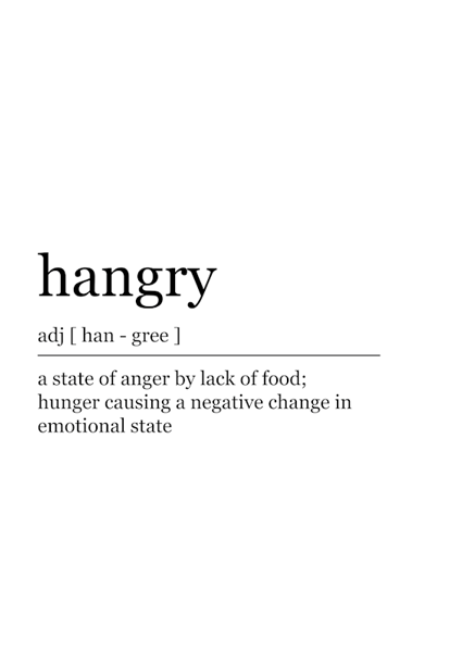 "Hangry a state of anger by lack of food; hunger causing a negative change in emotional state"