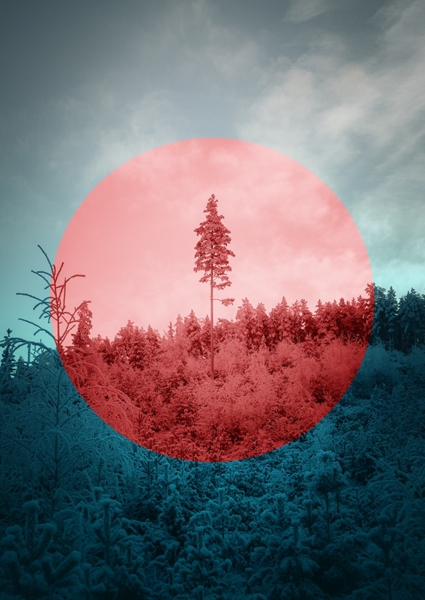 "Mindfullnes" poster af Jakob Ebbinger Didring. En ensom trætop står stolt midt i en skov, fanget i et rødt cirkelformet spotlight, der bryder det kølige blå landskab. Det er som naturens egen spotlight-scene – en leg med farver og perspektiv, der tvinger øjet til at stoppe op og tænke. En frisk, næsten futuristisk tilgang til den klassiske skovscene, som gør rummet levende på en måde, man ikke lige ser hver dag. Mindfullnes, ja – men med et twist.