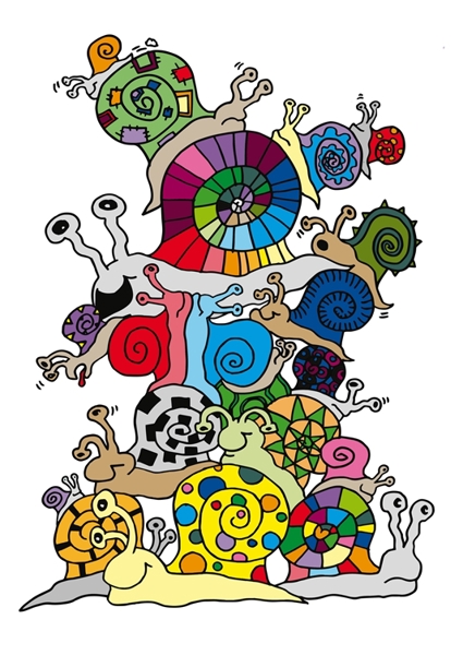 "The funny, colorful snails have built a tower. Everyone wants to be at the top. What a crowd."