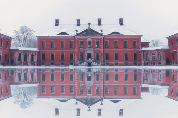 "Et slot i to verdener" poster af Robert Keilholtz. Et rødmalet slot dukker op midt i et vinterlandskab, hvor sneen lægger sig som et blødt tæppe. Den næsten spejlblanke is reflekterer bygningens symmetri, så det hele føles som to verdener smeltet sammen – eller et sneklædt eventyr i Mecklenburg-Vorpommern ved Østersøen. Det er arkitektur, der går i dialog med naturen, og man kan næsten høre stilheden tale. Men altså… det er jo bare for fedt at se sådan et klassisk slot i et helt nyt lys.
