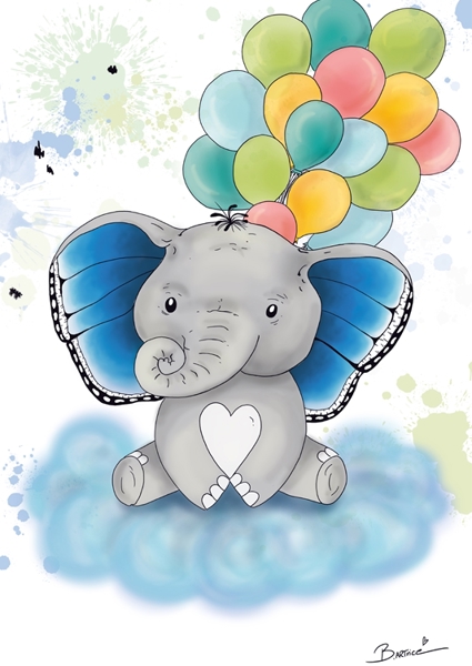 "Party Schmetterfant " poster af Beatrice Leeb. Her svæver en lille elefant med ører som sommerfuglevinger – lidt som en drøm, der lige har fået luft under vingerne. Bagved danser farverige balloner lystigt, mens den sidder på en blød sky, der næsten hvisker ‘bare slap af’. Perfekt til børneværelset, hvor fantasi og leg får frit spil. Det er som en visuel krammer, der siger ‘hej verden, kom og leg med mig’. Ikke bare sødt, men også lidt magisk – lige til at hænge op og smile til hver dag.