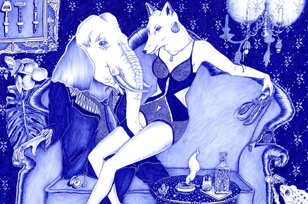 "Elefant og ræv" poster af Denise Cornelsen. I en natblå verden sidder en elefant og en ræv – lidt for afslappede, lidt for glamourøse, og helt umulige at placere. Den skeptiske frø med opera-briller i baggrunden siger alt om, at her er noget, der ikke helt stemmer. Lobster-telefonen og lysestagen på bordet? Jo, de skruer bare op for det absurde. Et surrealistisk øjeblik, hvor tid og fornuft smelter sammen – og man bare må grine lidt af det hele. Klar til at invitere det skæve ind i din stue.