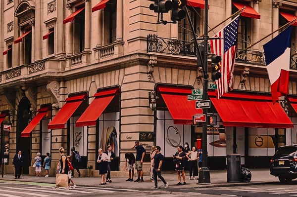 "A picture of New York taken at golden hour in beautiful evening sun. The picture shows the beauty of New York, intense colors and the wonderful city life. Wonderful to see here is the view of the Cartier Store on 5th Avenue with the distinctive red awnings."
