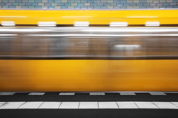 "Samariterstraße" poster af Calle Artmark. Her suser den gule S-Bahn forbi med en fart, der næsten kan mærkes i maven. Samariterstraße-stationen gemmer sig i baggrunden som et stille hint, mens den lange eksponering forvandler det hele til et drømmende, næsten flydende øjeblik. Linjerne og farverne leger i perfekt kaos – en urban symfoni af bevægelse og form, der får selv den mest stressede pendler til at stoppe op og se byen fra en ny vinkel. Men altså… det er jo bare Berlin, når det er bedst.