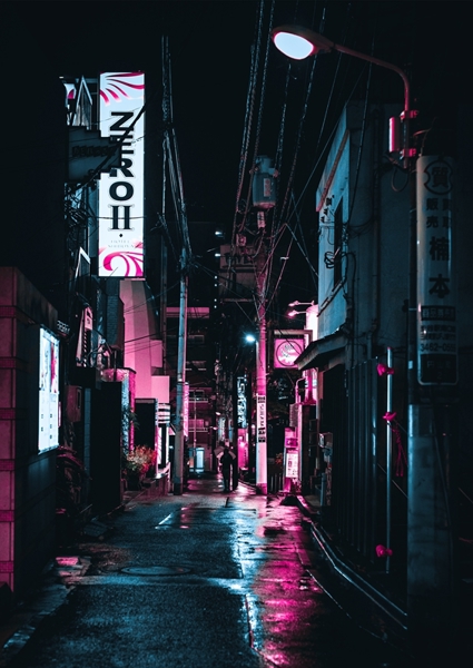 "City Cyberpunk Night Light" poster af Qreative. En smal gyde badet i neonrødt og blåt lys – våd asfalt spejler den futuristiske stemning, mens ledninger snor sig som byens årer over hovedet. Skiltet ’ZEROH’ lyser koldt op i mørket, og en ensom skikkelse forsvinder i det urbane netværk. Det er som at træde direkte ind i en synthwave-drøm, hvor tid og sted smelter sammen til et cyberpunk-øjeblik. Men altså… ikke bare en gade – en stemning, der hænger i luften.