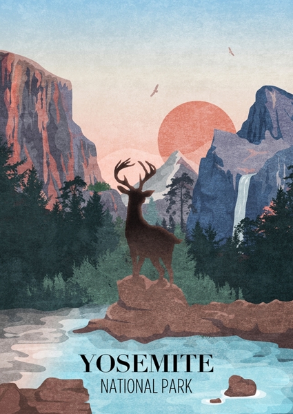 "Yosemite Nationalpark" poster af Emel Tunaboylu by The Artcircle. Et rådyr står som konge på sin klippe, mens solens varme kugle langsomt synker bag de ikoniske klipper i Yosemite. Vandfaldet kaster sit kølige fald mod floden, der snor sig roligt forbi. Det er ikke bare et landskab – det er en invitation til vildskab og ro på én gang. Naturen i sin mest episke form, fanget i et øjeblik, der både føles tidløst og helt nu. Perfekt til dig, der vil have lidt amerikansk vildmark ind i stuen.