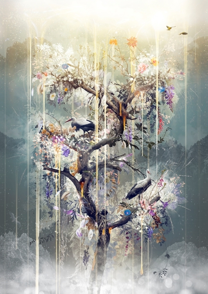 "Digital composition/hypercollage photography. All the elements were photographed by the artist himself and digitally merged. In my dream, I heard falling water – but at a very slow pace. As my vision became more clear, I could distinguish a tree standing in the center of a lake. "