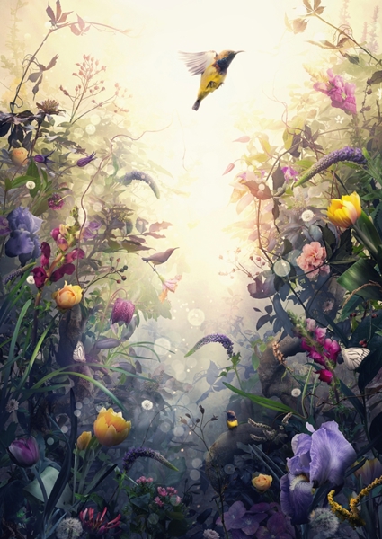 "Fremkomsten" poster af Jesper Krijgsman. Farverig vildskab, hvor blomster, insekter og fugle smelter sammen i et næsten drømmeagtigt kaos. Midt i alt det grønne og blomstrende svæver en kolibri – lille, lynhurtig, og fuld af liv, som om den lige er sprunget ud af en anden dimension. Det er naturens egen fest, pakket i digital collage, der hiver dig direkte ind i en verden, hvor alt spirer og vokser på én gang. Ikke bare en dekoration, men en invitation til at stoppe op og mærke magien.