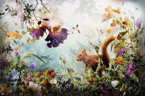 "Digital composition/hypercollage photography. All the elements were photographed by the artist himself and digitally merged. Find me in a hidden place. An untouched meadow that grows in my head. Like the creatures it inhabits, I may reach for it in dark times and find my hiding place. "