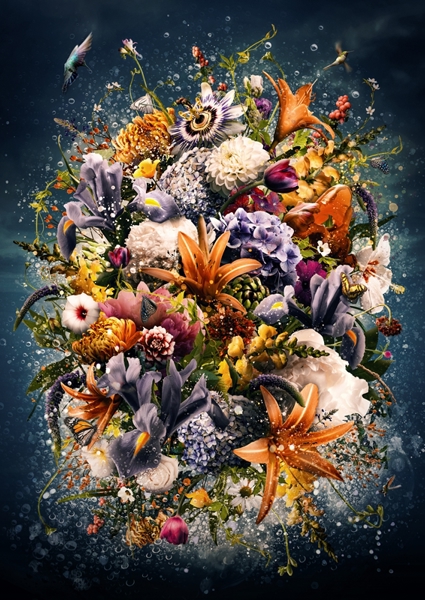 "Amaranthin" poster af Jesper Krijgsman. En eksplosiv buket, der nægter at visne – som om naturen selv har trykket på turbo-knappen. Blomster, insekter og et par sommerfugle svæver rundt i et digitalt univers, hvor detaljer og farver smelter sammen i en næsten surrealistisk symfoni. Man kan næsten høre livets summen og mærke den botaniske energi, der bare ikke vil stoppe. Perfekt til dem, der har brug for et frisk pust af vildskab på væggen.