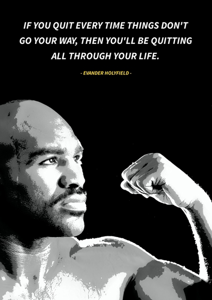 "Evander Holyfield citater " poster af Lunziii art. Et stærkt, sort-hvidt portræt af Evander Holyfield, hvor hans beslutsomme blik og knyttede næve næsten springer ud af billedet. Teksten ovenover – en no-nonsense påmindelse om at blive ved, selv når livet driller – gør det til mere end bare et billede. Det er som en daglig dosis power, pakket ind i minimalistisk grafik, der taler direkte til både boksefans og alle, der trænger til et spark i røven. Ren motivation, rå og ærlig.