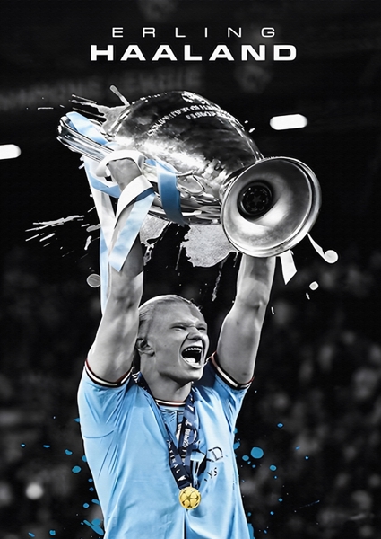 "Erling Haaland Plakat" poster af KunStudio. Erling Haaland i fuld triumf, løftende Champions League-trofæet over hovedet som en ægte legende – øjeblikket fanget i en kraftfuld sort-hvid komposition med sprøjt af akvarelblå, der bryder gennem billedet. Det er ikke bare en plakat, det er en hyldest til øjeblikkets rå energi og råstyrke, hvor sport møder kunst i en perfekt fusion. Perfekt til alle, der elsker fodbold med et twist af moderne vibes. Men altså… hvem kan stå for dét smil og den attitude?