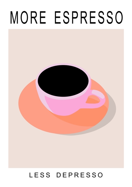 "More Espresso - Less Depresso" poster af ByKammille. En enkel, men alligevel sarkastisk hyldest til kaffekulturen – en pink espresso kop med sort kaffe, placeret på en orange underkop, der næsten råber på morgenhumor. Teksten “More Espresso – Less Depresso” fanger den perfekte balance mellem livets små kicks og den lette selvironi, der får køkkenet til at føles lidt sjovere. Minimalistisk, farverig og lige til at sætte et smil på læben. Klar til at overtage væggen og humøret.