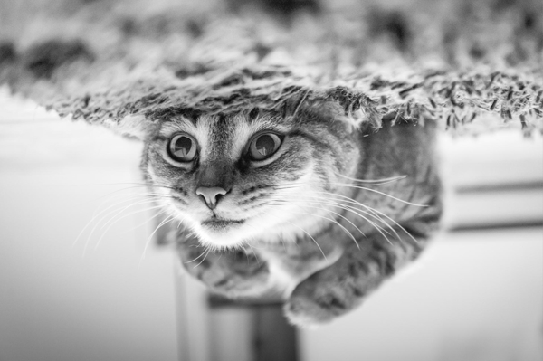 "Kat 02" poster af Keana Masha. En kat, der leger med perspektivet og vender verden på hovedet – bogstaveligt talt. De store øjne og de spidse ører fanger øjeblikkets nysgerrighed og legesyge, mens det bløde tæppe over hovedet giver en følelse af skjul og eventyr. Sort-hvid paletten gør det hele mere tidløst og råt, som en stille fortælling om det uventede i det velkendte. Perfekt til dem, der elsker katte med kant og en smule humor i hjemmet.