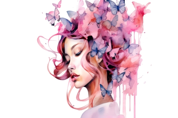 "Frau mit Schmetterling die um ihren Kopf fliegen, im Aquarellstil."