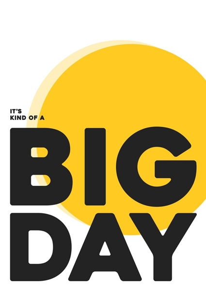 "Stor dag" poster af Kind Of A Big Day. En skarp og legende plakat med en gul sol, der næsten eksploderer af energi bag de store, sorte bogstaver. Teksten "It's kind of a BIG DAY" er en uundgåelig påmindelse om, at nogle dage bare kræver ekstra opmærksomhed – ja, sådan en dag, hvor alt kan ske. Perfekt til dig, der elsker en visuel high-five, der både puster til motivationen og giver rummet et frisk pust. Det her er ikke bare vægpynt – det er et statement.
