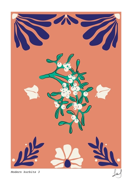 "Moderne kurbits 3" poster af Warmteacup. En frisk fortolkning af kurbits, hvor misteltenen tager centrum og danser med agurkeløvens former – et stille nik til Västerås’ lokale stolthed. Blomster og blade rammer kanterne med en legende energi, mens farverne popper med varme og kant. Det er som om tradition møder nutid i en uventet, men cool fusion, der giver enhver væg et glimt af noget både velkendt og nyt. Klar til at sprænge rammerne for klassisk design.
