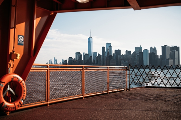 "Skyline New York City" poster af Lukas Boldt. Den her udsigt fra Staten Island Ferry fanger New Yorks skyline, som den lige står der – skyskrabere mod en klar himmel, mens det orange metalramme leger med kompositionen. Livredderen hænger diskret og minder om, at eventyret på vandet lige er begyndt. Det er som at fange byens puls på et splitsekund – urban energi møder roen på vandet, og pludselig bliver du en del af det hele. Rå, ægte og lige til at hænge op.