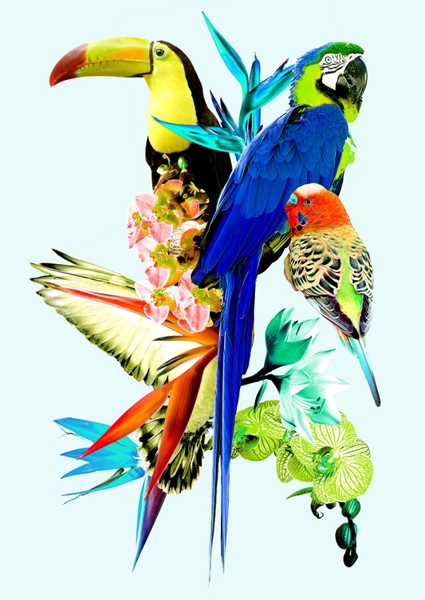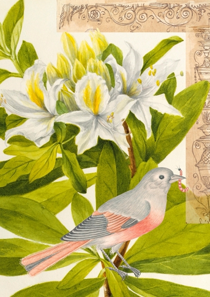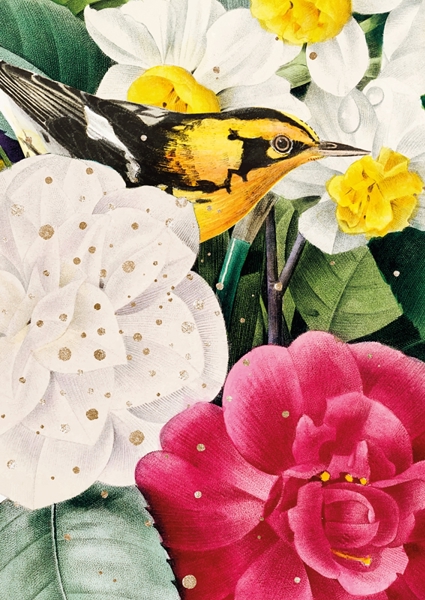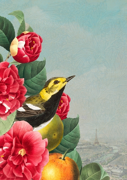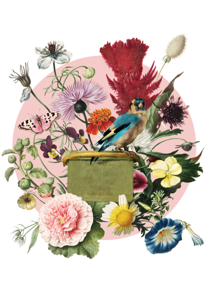 "Bright vintage collage inspired by historical botanical and zoological drawings with an eurasian jay and Kaiser's crown, Jasmine and Pistachios. Under the collage the names of the plants and animals are listed."