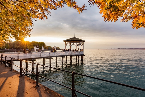 "Sunset Bar at the Fischersteg in Bregenz at sunset, Lake Constance, Austria"