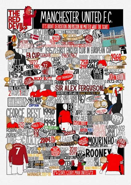 "Ringens fællesskab" poster af Mono K. Her er en sprød, minimalistisk hyldest til Manchester United – en collage, der koger klubbens ikoniske øjeblikke, legender og citater ned til et visuelt råb om passion. Fra Sir Alex Fergusons epoke til skiftende stjerner som Rashford og Højlund – alt er fanget i et legende, typografisk kaos. Det er ikke bare kunst, det er en rå, energisk ode til fodboldens magi, perfekt til enhver fan, der vil have lidt af Old Traffords ånd direkte hjem. Men altså… det her fanger virkelig sjælen.