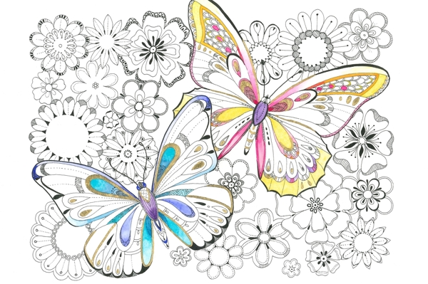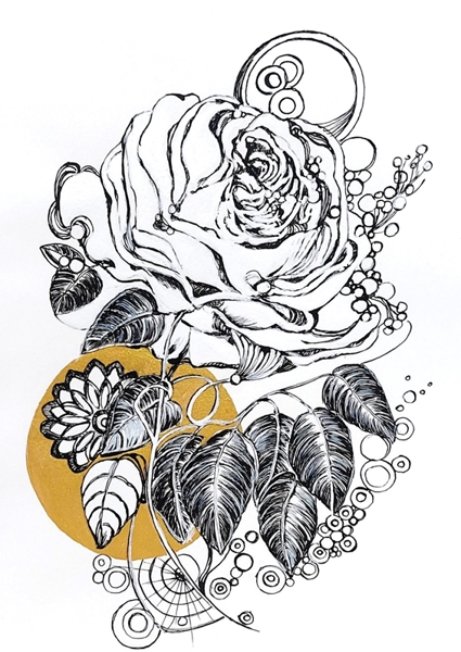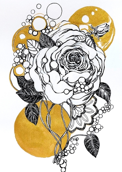 "Rose and butterfly, artistic drawing full of harmony. The white flower of rose flourishes on a pastel background painted with fantasy and lightness. A picture full of delicacy, subtlety and charm with a little splendor in golden accents."