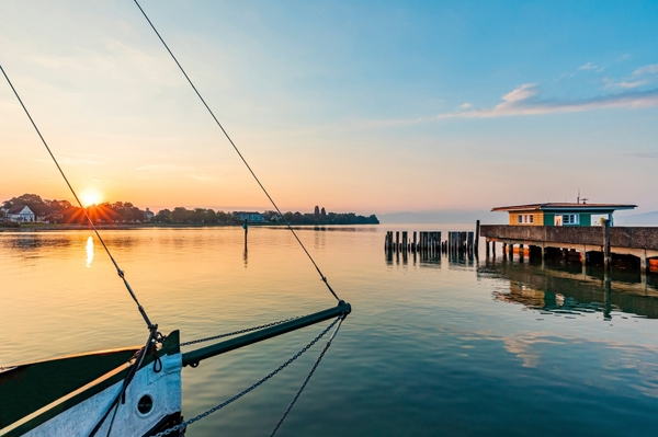 "Old sailing boat MÖWE JONATHAN and the landing stage in Langenargen on Lake Constance at sunrise."