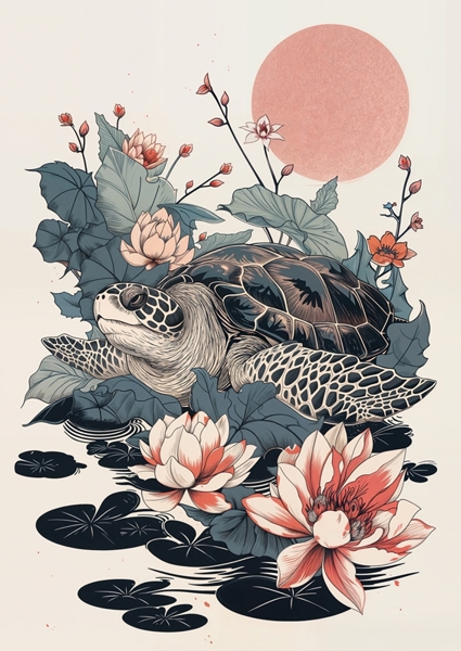 "Afslapning" poster af Friedrich XO. En skildpadde chiller midt i et blomsterhav, hvor vilde vandliljer og frodige blade smelter sammen i en næsten zen-agtig vibe. Den detaljerede skal står i skarp kontrast til de bløde, varme toner fra den rosa sol, der hænger dovent på himlen – altså, det er næsten som om, tiden står stille her. Perfekt til rum, der trænger til et strejf af naturens rolige kaos. Men altså… hvem kan ikke bruge lidt skildpadde-ro i en travl hverdag?