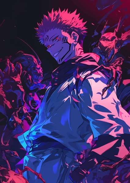"Det møde Sukuna" poster af Mark Simon. Kast dig ind i et mørkt Tokyo-univers med denne vilde illustration af Sukuna – King of Curses med attitude og en selvsikker smil, der siger “jeg ejer det her”. Farverne eksploderer i neonagtige blå og pink nuancer, der får det onde til at danse i skyggerne omkring ham. En perfekt fusion af manga, retro gaming og moderne fantasy, som skiller sig ud på væggen – lidt som en digital drøm, der aldrig helt slipper taget.