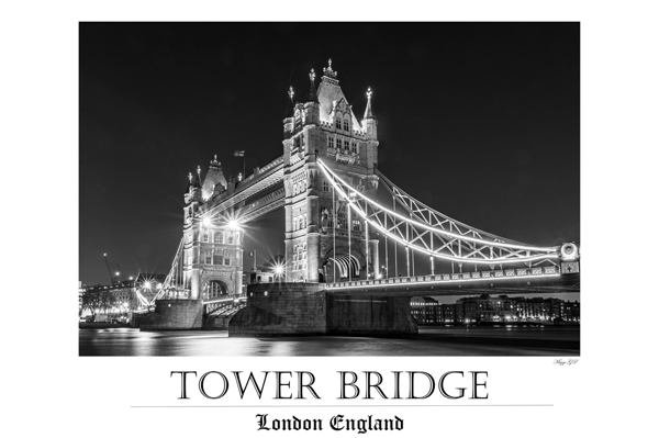 "Tower Bridge - London" poster af Migge GP. Et ikonisk blikfang i sort-hvid, hvor Tower Bridge står knivskarpt mod Londons nattehimmel. Den lange eksponering fanger broens lys som en næsten magisk glød – lidt som en urban drøm, der spejler sig i Themsens rolige vand. Det her er ikke bare et foto, men en invitation til at mærke byens pulserende historie og moderne charme på én gang. Perfekt til dem, der elsker, når klassisk arkitektur får en ny, tidløs vibe.