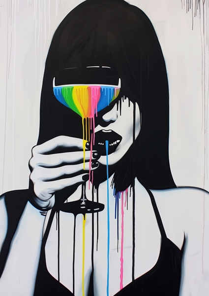 "The picture shows a stylish woman holding a cocktail. The drink drips from the glass in bright rainbow colors, while the woman opens her lips slightly in a seductive manner. This modern work of art combines elegance and color in a mesmerizing display. A must for lovers of unique art."
