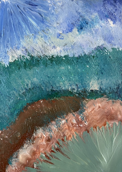 "Åbne landskaber" poster af Angelica M. Farverne smelter sammen i et uventet møde mellem havets dybde og himlens blå nuancer, hvor teksturen nærmest kan mærkes under fingrene. Den grønne bølge bryder mod det brune og beige i forgrunden – et øjeblik fanget i farver og bevægelse. Det er lidt som at stå midt i en vild, ukendt kystlinje, hvor naturen spiller med i en evig dans. Perfekt til dig, der vil have kunst, der taler til både ro og eventyrlyst.