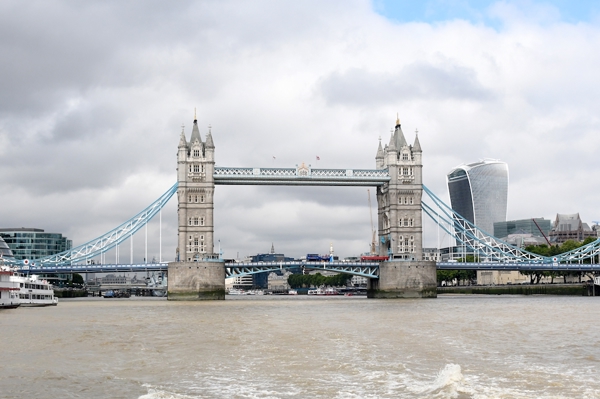 "Tower Bridge, London" poster af Kjell Lundqvist. Her står Tower Bridge, ikonisk og uanfægtet midt i Londons pulserende kaos. De blå og hvide stålender strækker sig over Themsen som et gammelt, men stadig hipt monument – en slags historisk og moderne mashup, der siger “Velkommen til London, baby.” Bagved sniger den futuristiske Walkie Talkie sig ind, som om den prøver at stjæle spotlightet. Det er ikke bare en bro – det er Londons egen tidsmaskine, fanget i et øjeblik med byens evige energi og eventyr.