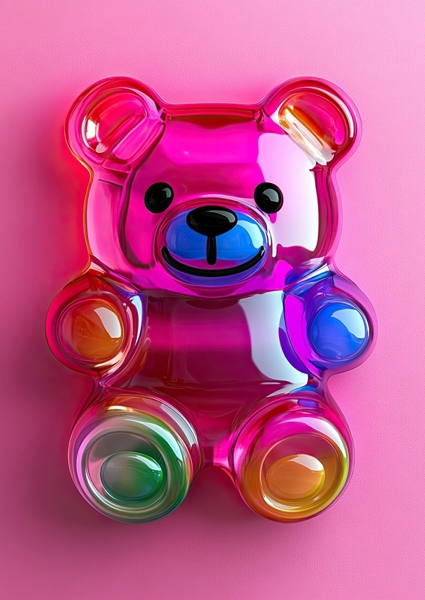 "A vibrant gummy bear bursting with color and joy! This glossy, translucent design captures playful energy and childhood nostalgia in a modern artistic expression, set against a bold pink background for a pop of fun."