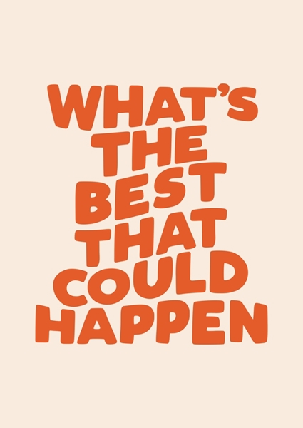 "Bedste resultat citat" poster af Brett Wilson. En knaldorange typografi, der ikke bare siger noget – den råber optimisme lige i fjæset. "What’s the best that could happen" bliver til en slags daglig reminder om, at verden måske alligevel er lidt mere spændende, end man tror. Det er minimalistisk, retro og perfekt til hjemmekontoret eller det kreative hjørne, hvor man trænger til lidt ekstra pep. Ren visuel selvtillid, der får dig til at tænke: hvorfor ikke?