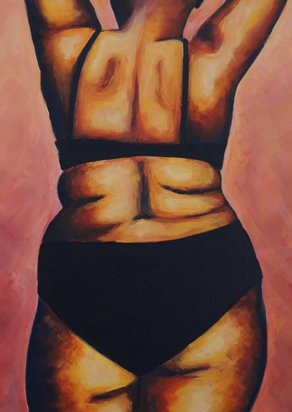 "Langsom dans" poster af Alina Castro. Et øjeblik fanget i varme toner – kroppen bevæger sig, uden filter, uden skam. Understøttet af kontrasten mellem de bløde skygger og den sorte undertøj, bliver det hele til en slags hyldest til det ægte, til det umiddelbare. Det er ikke en scene, det er en slow dance med dig selv, hvor selv de små folder fortæller historier. Man kan næsten mærke rytmen, pulsen, og en slags stille oprør mod perfektion. Det her er kunst, der tør være tæt på.