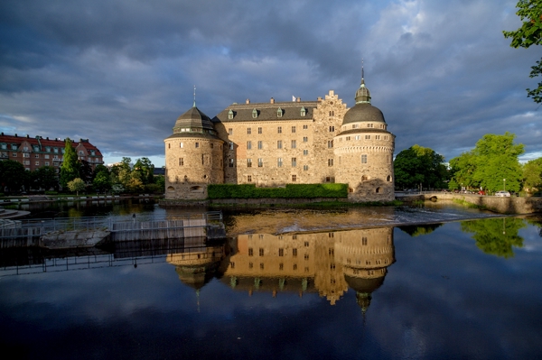 "Örebro Slot" poster af Susanne Flink. Ørebro Slot spejler sig i det stille vand, mens skyerne langsomt trækker sig sammen over himlen. Den massive stenmur står som et monument over tidens gang – næsten som om historien selv har sat pause. Grønne træer rammer scenen ind, og lyset leger med skyggerne, der danser på facaden. Et øjeblik fanget mellem fortid og nutid, lige til at lade blikket glide hen over – og bare blive hængende.