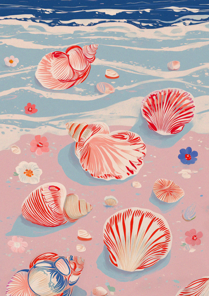 "Muslingeskaller" poster af Malin Wilje. En drømmende samling af muslinger i bløde pastelfarver spreder sig over en rolig strand med bølger, der kærtegner kysten. De fine nuancer af pink og blå skaber en fredfyldt stemning, hvor hver musling med sine mønstre føles som en lille skat fra havet. Perfekt til at tilføre et strejf af kystcharme til ethvert rum – uden at få sand i skoene. Men altså, hvem har ikke brug for lidt strandvibes hjemme?