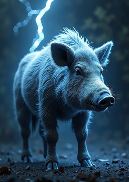 "A sow, a bright flash in the background. She's now recharged and ready to go. In the night, in the bluish light. The Power Sow (wild boar)."