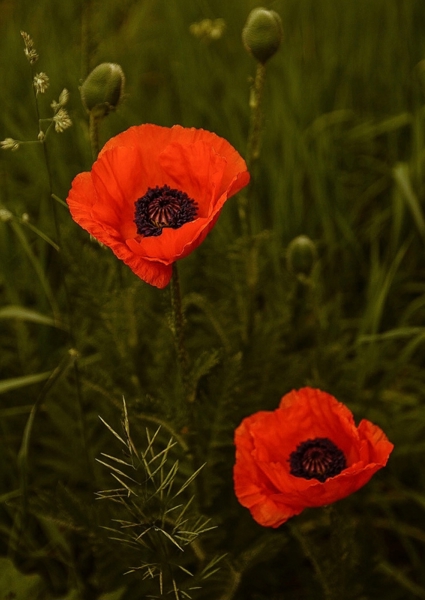 "This artwork captures vibrant red poppies in a lush green field, highlighting their delicate petals and contrasting dark centers. Nature, floral, and botanical themes evoke a sense of tranquility and natural beauty."