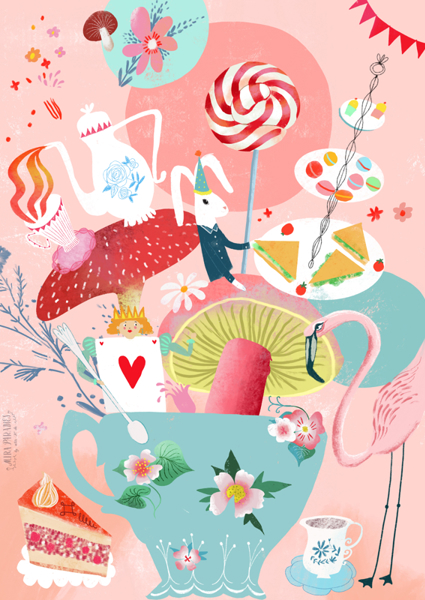 "Whimsical Alice in Wonderland illustration featuring a tea party with a rabbit, flamingo, playing card character, and sweets. Vibrant colors and surreal elements capture the fantasy and charm of this classic tale."