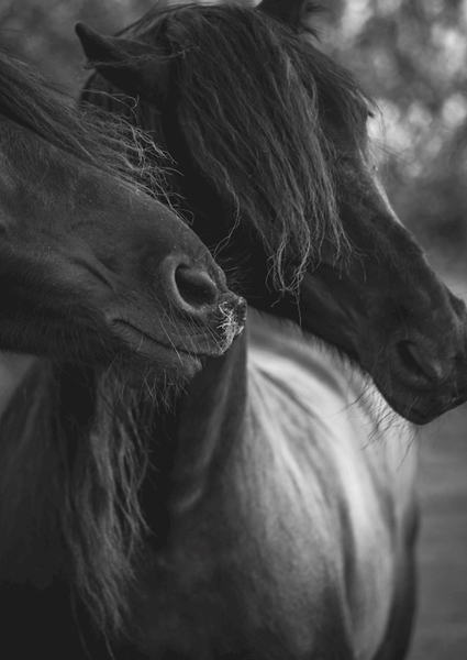 "Frieser heste" poster af Sofia Smedberg. To friesiske heste i et nærbillede fanger øjeblikkets stille samhørighed – deres manker blæser let og tilfører bevægelse til det ellers rolige udtryk. Det monochrome format fremhæver teksturer og dybde, så hver muskel og hårstrå står skarpt. Man mærker næsten historiens vægt og naturens rå elegance, som Holland har givet videre i denne majestætiske race. Ikke bare heste – mere som levende skulpturer, der inviterer til refleksion. Men altså, hvem kan stå for det?