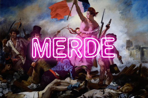 "“I have depicted the people marching to regain their rights, armed with courage—and now, neon.” —Inspired by Eugène Delacroix “MERDE” is the outburst of a fed-up crowd—a modern cry layered onto the romanticized vision of rebellion."