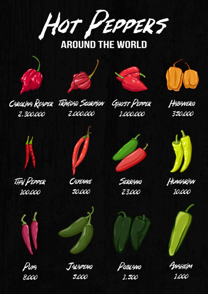 "This artwork celebrates the fiery variety of chili peppers across the globe. From the gentle Anaheim to the intense Carolina Reaper – each one represents a taste adventure. "