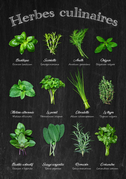 "Smagens have" poster af Thomas Klee. En samling af tolv friske, grønne krydderurter præsenteret på en mørk skiferplade – hver med navne på både fransk og latin, fordi man jo skal kunne lidt botanisk nørderi, når man alligevel er i gang. De sprøde blade og stilke popper mod den antracitfarvede baggrund og inviterer til både madlavning og dekoration. Perfekt til køkkenet, hvor det ikke bare handler om smag, men også om stil og lidt fransk charme. Men altså… det er jo også et statement, når basilikum og koriander får deres egne spotlights.