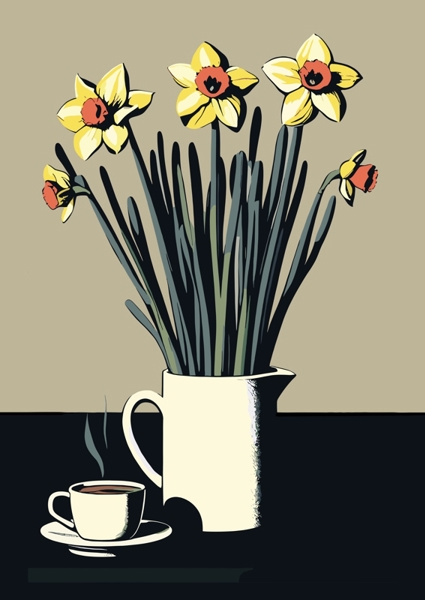 "Brighten your space with this charming print of vibrant yellow daffodils, perfectly paired with a classic milk jug and a steaming cup of coffee. This delightful arrangement not only adds a splash of colour to your home but also infuses your mornings with warmth and cheer!"