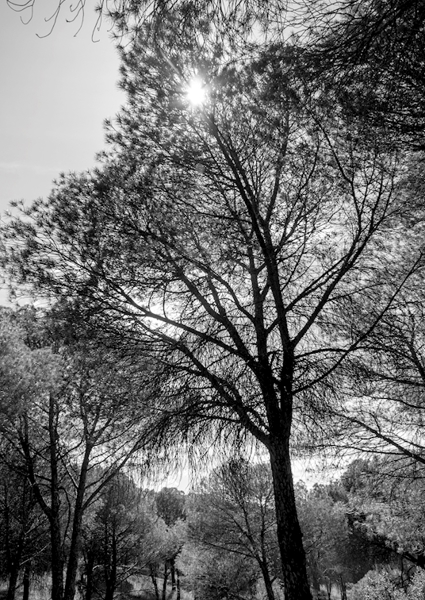 "Fyrretræer" poster af Jorge Recio Garcia. Sort-hvid magi i træernes verden – et øjeblik hvor solens stråler sniger sig gennem de tynde nåle og kaster et spil af lys og skygger, der næsten føles levende. Det er som en stille invitation til at stoppe op, trække vejret dybt og bare være til. Barkens struktur og nålenes fine detaljer træder frem i det høje kontrastspil, som giver en næsten filmisk stemning. En rå, men alligevel fredfyldt hyldest til naturens egen poesi.