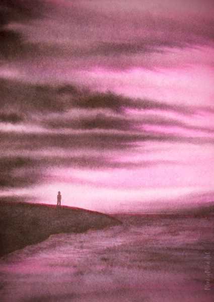 "I lyset af midnatssolen" poster af Maria Bergmark. En stille silhuet står på kanten og kigger ud over et hav, hvor lyserøde og mørke skyer smelter sammen i en drømmende sommernat. Akvarellens flydende penselstrøg fanger den magiske stemning ved Bjuröklubb, hvor horisonten nærmest opløses i et øjeblik af uendelig ro og refleksion. Det er som at træde ind i en verden, hvor tid og drømme flyder sammen – lige til at lade blikket dvæle i.